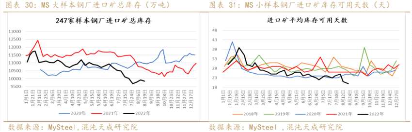 5. 鋼廠庫(kù)存:本周大樣本鋼廠進(jìn)口礦總庫(kù)存環(huán)比減少77.43萬(wàn)噸至9843.3萬(wàn)噸,仍處同期低位;小樣本鋼廠進(jìn)口礦平均庫(kù)存可用天數(shù)繼續(xù)減少1天至20天,再創(chuàng)近年歷史新低。
