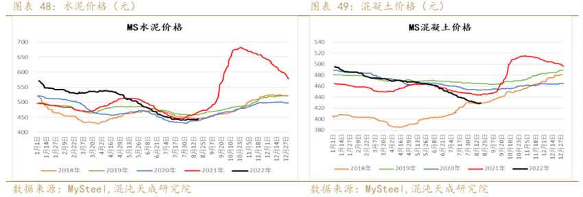4. 水泥、混凝土價(jià)格:本周水泥市場(chǎng)價(jià)格有小幅上揚(yáng),混凝土市場(chǎng)價(jià)格也略有上升,但二者仍處于同期低位,顯示近期終端工地對(duì)建材需求依然不佳。