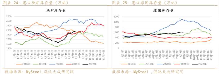 2. 分品種庫(kù)存:塊礦庫(kù)存增加13.61萬(wàn)噸,增幅0.7%;球團(tuán)庫(kù)存減少8.85萬(wàn)噸,降幅1.4%。