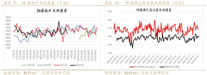 2. 進(jìn)口礦到港:上周45港到港量環(huán)比大降307.5萬(wàn)噸至2113.2萬(wàn)噸,其中26港到港量環(huán)比減少299.9萬(wàn)噸。據(jù)前期澳巴發(fā)運(yùn)推算,預(yù)計(jì)近兩周進(jìn)口礦到貨先抑后揚(yáng),整體仍變動(dòng)不大。