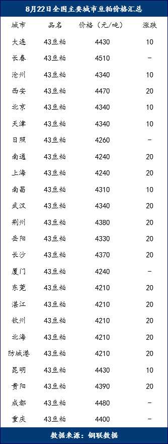價(jià)格方面,近期連粕漲勢(shì)依舊高位不下,截止8月22日連粕震蕩上漲,截至收盤主力合約M01報(bào)收于3698元/噸,漲36元/噸,漲幅0.98%,持倉(cāng)106.6萬手,日增倉(cāng)0.44萬手。全國(guó)各地市場(chǎng)豆粕現(xiàn)貨整體穩(wěn)中上調(diào)10-20元/噸,北方地區(qū)4340-4430元/噸領(lǐng)漲全國(guó),華南地區(qū)淪陷全國(guó)低價(jià)區(qū)4210-4240元/噸。相比較去年同期北方地區(qū)豆粕價(jià)格在3610-3760元/噸,華南地區(qū)3590-3620元/噸,漲620-730元/噸,同時(shí)期價(jià)格相差甚遠(yuǎn),在6月中下時(shí),國(guó)內(nèi)豆粕庫(kù)存在百萬噸水平階段,現(xiàn)貨價(jià)格也未出現(xiàn)較大跌幅,最低的廣東區(qū)域市場(chǎng)回落至3930元/噸后繼續(xù)漲至4000元/噸一線,低價(jià)時(shí)曇花一現(xiàn)并利多消息一釋放就迅速站穩(wěn)。高價(jià)下促進(jìn)終端飼企的購(gòu)買情緒,提貨積極性濃厚,推動(dòng)豆粕消耗,其為一。