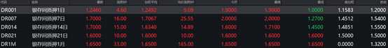銀銀間回購(gòu)定盤利率全線上漲。FDR001報(bào)1.26%,漲10個(gè)基點(diǎn);FDR007報(bào)1.70%,漲30個(gè)基點(diǎn);FDR014報(bào)1.64%,漲14個(gè)基點(diǎn)。
