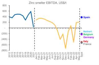 由于歐洲精煉鋅企業(yè)相較國內(nèi)而言更為集中,其產(chǎn)能約在230萬噸,占據(jù)全球精煉鋅總產(chǎn)能的18%。而歐洲最大的精煉鋅企業(yè)就是嘉能可,產(chǎn)能主要分布在西班牙、德國、意大利四家冶煉廠,最早一次因為能源危機引發(fā)的鋅價飆升是在去年10月,嘉能可宣布其在歐洲三國的80萬噸鋅冶煉廠錯峰生產(chǎn);第二大企業(yè)就是Nyrstar,在同期也宣布將削減其三家歐洲冶煉廠(荷蘭Budel、比利時的Balen以及法國的Auby)產(chǎn)量的50%。目前歐洲接近50萬噸冶煉廠處于關(guān)停狀態(tài),整個歐洲鋅產(chǎn)能利用率將下降至70%左右,而正常情況下歐洲鋅冶煉產(chǎn)能利用率高達95%。