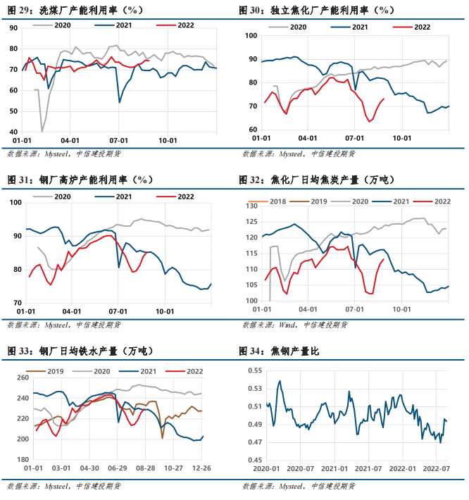 本周,洗煤廠產(chǎn)能利用率環(huán)比下滑,其他環(huán)節(jié)產(chǎn)能利用率持續(xù)回升。高爐依舊在復(fù)產(chǎn)階段,對(duì)原料需求不減;兩輪落地后,焦企利潤(rùn)得以修復(fù),焦企開(kāi)工積極,廠內(nèi)多維持低位庫(kù)存水平,焦鋼產(chǎn)量比下滑;產(chǎn)地煤礦供應(yīng)維持平穩(wěn),山西、內(nèi)蒙等地部分煤礦產(chǎn)量有所恢復(fù),部分煤種受安全檢查及電煤保供影響,供應(yīng)稍顯緊張。