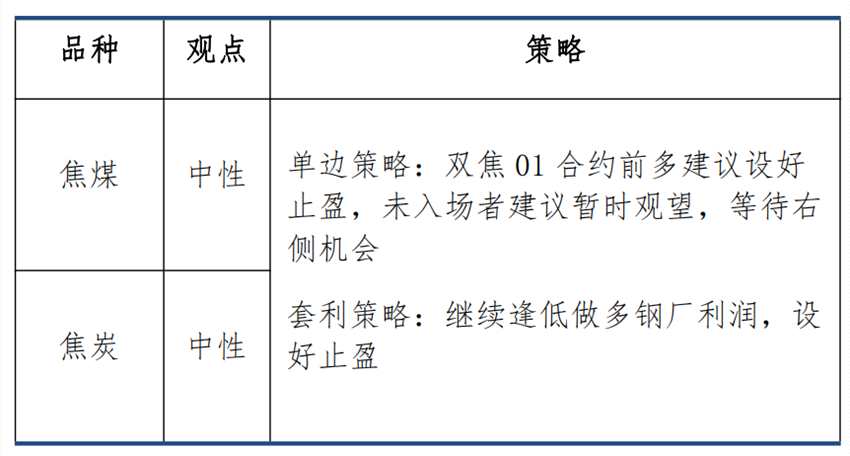 在“就業(yè)優(yōu)先”的政策基調(diào)下,疊加下半年強(qiáng)力刺激政策落空,我們預(yù)計(jì)疫情改善后地產(chǎn)、基建亦難有起色。LPR利率下調(diào)疊加穩(wěn)經(jīng)濟(jì)接續(xù)措施發(fā)布,市場(chǎng)宏觀情緒好轉(zhuǎn),原料庫(kù)存極低,01合約多頭交易冬儲(chǔ)需求及旺季需求修復(fù),空頭交易美聯(lián)儲(chǔ)加息與唐山鋼廠減產(chǎn)800萬(wàn),預(yù)計(jì)01合約或震蕩運(yùn)行。值得注意的是,01合約已切換為主力合約,走勢(shì)主要受情緒和資金面影響,關(guān)注國(guó)內(nèi)穩(wěn)經(jīng)濟(jì)政策與海外加息進(jìn)展??紤]預(yù)期面多空交織,操作上,雙焦01合約前多建議設(shè)好止盈,未入場(chǎng)者建議暫時(shí)觀望,等待右側(cè)機(jī)會(huì)。