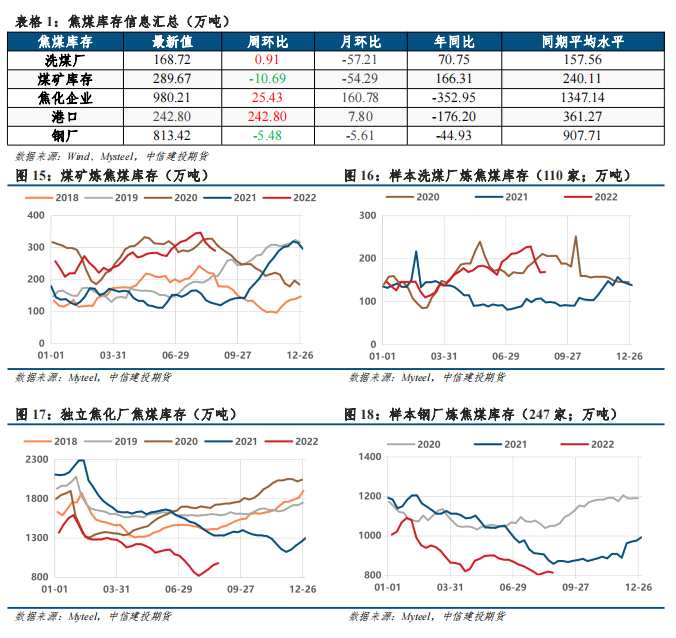 焦煤:煤礦去庫(kù)放緩,洗煤廠庫(kù)存轉(zhuǎn)增,焦化廠補(bǔ)庫(kù)放緩,鋼廠庫(kù)存轉(zhuǎn)降,港口庫(kù)存略有增加;整體庫(kù)存增加,但仍在低位,焦煤庫(kù)存驅(qū)動(dòng)中性。