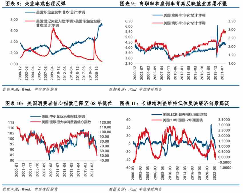 從非農(nóng)存量同比數(shù)據(jù)來看增速略有回落,雖然依然高于疫情前的水平,但是從趨勢上看,就業(yè)人數(shù)存量增速的回落對于就業(yè)市場而言并不是一個(gè)非常樂觀的信號,它通常暗示這后期失業(yè)率有可能出現(xiàn)反彈。此外,美國的離職率快速走高,但是雇傭率卻呈現(xiàn)疲軟走勢,離職率與雇傭率的劈叉程度走闊,也反映出美國居民端的就業(yè)意愿不強(qiáng)。目前的美國經(jīng)濟(jì)數(shù)據(jù)來看,經(jīng)濟(jì)下行壓力在加大。