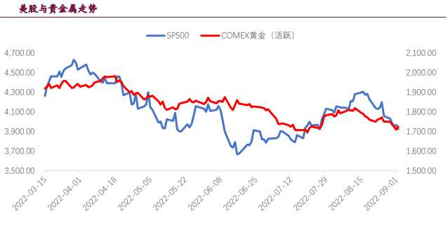 從歷史的角度來看,美債實(shí)際收益率走勢(shì)與金價(jià)走勢(shì)在長(zhǎng)期呈現(xiàn)高度負(fù)相關(guān),相關(guān)系數(shù)為負(fù)0.9以上。在美聯(lián)儲(chǔ)加息縮表的背景下,美債實(shí)際收益率將持續(xù)上行并且使貴金屬承壓,但當(dāng)前衰退交易使美債收益率上行速度放緩。