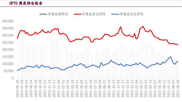 CFTC持倉(cāng)周報(bào)來看,非商業(yè)多頭持倉(cāng)從3月15日開始回落。根據(jù)8月30日數(shù)據(jù)顯示,較上周多頭持倉(cāng)減少了2113張,空頭持倉(cāng)增加了6000張,多頭凈持倉(cāng)減少了8113張。