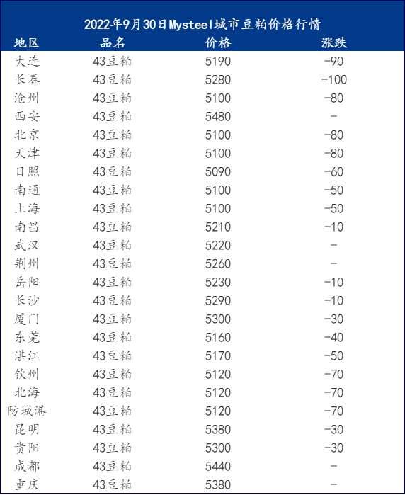 國慶備貨的最后一個工作日中,國內(nèi)豆粕市場價格依舊居高不下,但由于國內(nèi)油廠現(xiàn)貨庫存嚴(yán)重偏低,不斷擴(kuò)大的基差是豆粕保持強(qiáng)勢運行的主要支撐。具體來看現(xiàn)貨市場價格情況,9月30日連粕沖高回落,截至午盤主力合約M01合約報收于4070元/噸,跌32元/噸,跌幅0.78%,持倉148萬手?,F(xiàn)貨方面,今日貿(mào)易商豆粕現(xiàn)貨報價下跌70-80元/噸,其中天津貿(mào)易商報價5100元/噸跌80元/噸,山東貿(mào)易商報價5090元/噸跌60元/噸,江蘇貿(mào)易商報價5100元/跌50元/噸,廣東貿(mào)易商報價5160元/噸跌40元/噸。