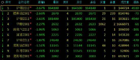 10月21日午盤收盤,國內(nèi)期貨主力合約多數(shù)下跌。滬錫、燃料油、滬鎳、甲醇跌超2%,液化石油氣(LPG)、尿素、滬鋅跌近2%。漲幅方面,油菜籽漲超2%,國際銅、短纖漲超1%。