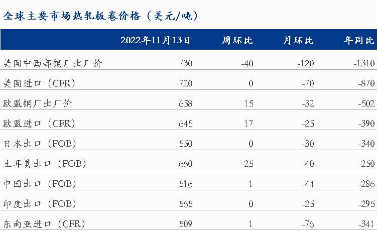 由于市場庫存過剩和持續(xù)的悲觀預(yù)期,本周歐洲熱卷交易活動(dòng)很少。另一方面,主導(dǎo)鋼廠持續(xù)擴(kuò)大減產(chǎn)范圍提振了市場價(jià)格。鋼鐵巨頭安塞樂米塔爾在三季度財(cái)務(wù)報(bào)告中表示,預(yù)期2022年歐洲鋼鐵需求同比下降7%,鑒于第四季度歐洲鋼材價(jià)格和需求預(yù)期仍然悲觀,計(jì)劃其核心生產(chǎn)基地的減產(chǎn)活動(dòng)將持續(xù)到年底,四季度減產(chǎn)幅度或達(dá)同比20%。周五,Mysteel評(píng)估南北歐S235JR熱卷綜合出廠價(jià)格為658美元/噸EXW,周環(huán)比上漲15美元/噸。