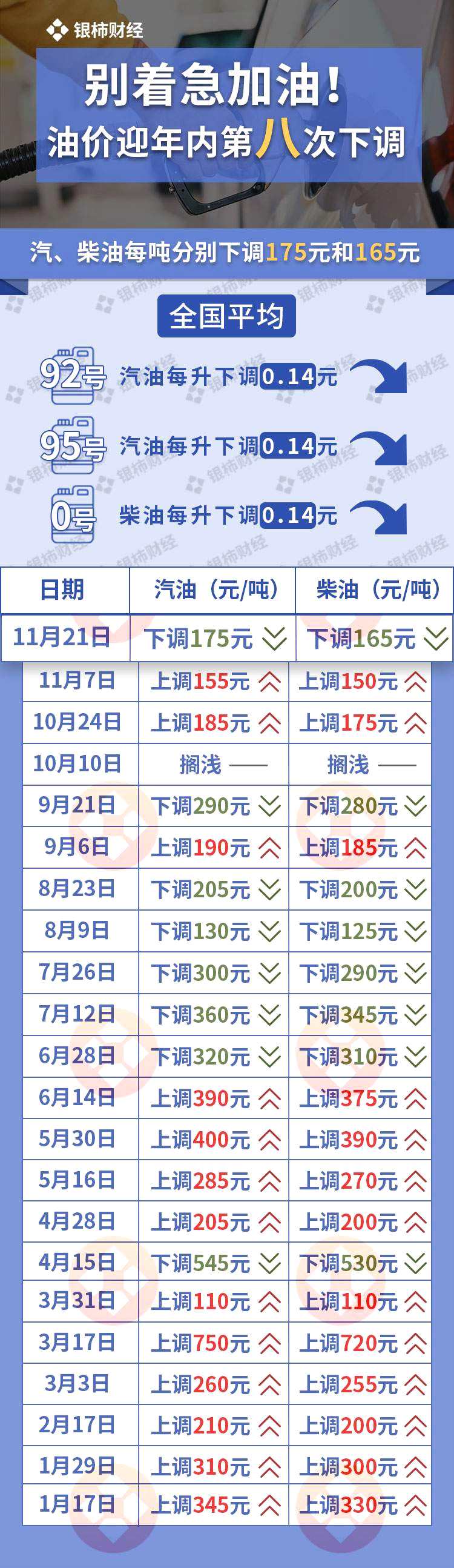 據(jù)國家發(fā)改委官網(wǎng)消息,根據(jù)近期國際市場油價變化情況,按照現(xiàn)行成品油價格形成機制,自2022年11月21日24時起,國內(nèi)汽、柴油價格(標(biāo)準(zhǔn)品,下同)每噸分別降低175元和165元。