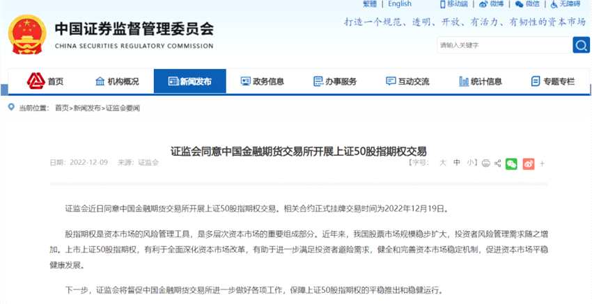 同日,證監(jiān)會發(fā)文稱,證監(jiān)會近日同意中金所開展上證50股指期權交易。相關合約正式掛牌交易時間為2022年12月19日。