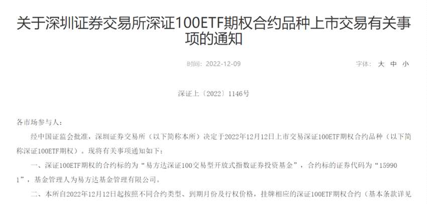 摘要: 12月9日訊(記者周曉雅)深證100ETF期權上市工作緊鑼密鼓進行中,今日,深交所宣布,深證100(159901)ETF期權將于12月12日(即下周一)上市交易。
