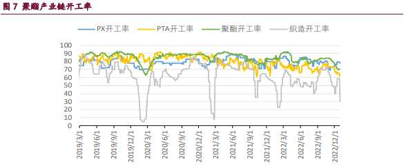 供需結(jié)構(gòu)來看,近期PTA裝置檢修降負(fù)維持偏多,開工率依然處于低位,短期供應(yīng)量較為有限。而中長(zhǎng)期隨著新裝置的逐步投放,供應(yīng)端壓力依然較大。需求端聚酯各品種利潤(rùn)在近期開啟修復(fù),同時(shí)庫存量環(huán)比有所下降,但絕對(duì)庫存量同比依然處于高位狀態(tài)。終端織造近期開工再度回落,市場(chǎng)新訂單稀少疊加員工陸續(xù)返鄉(xiāng)使得織造開工持續(xù)下滑。