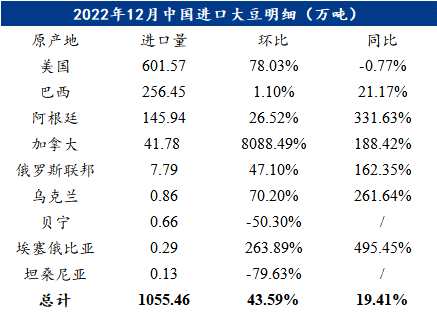摘要: 一、大豆進口方面據(jù)海關(guān)總署公布數(shù)據(jù)顯示,中國12月大豆進口1056萬噸,環(huán)比增加321萬噸,增幅44%;同比增加169萬噸,增幅19%。此為2021年6月以來的最高月度進口量。