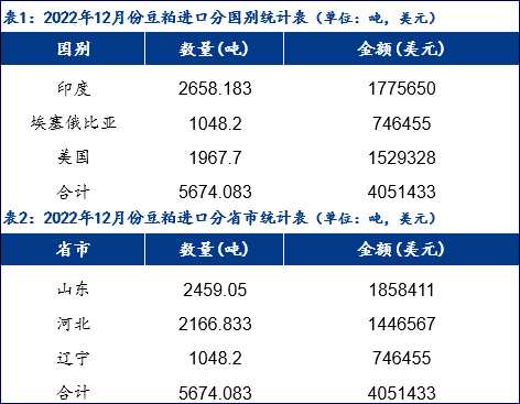 據(jù)海關(guān)總署公布數(shù)據(jù)顯示,中國2022年12月豆粕進口量5674.083噸,同比減少10.17%,環(huán)比增加593.65%。12月中國進口豆粕數(shù)量有所上升,因前期船期延誤。