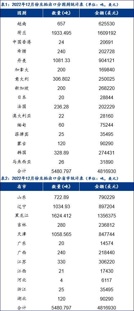 據(jù)海關(guān)總署公布數(shù)據(jù)顯示,中國2022年12月豆粕出口量5480.797噸,同比減少78.7%,環(huán)比減少21.47%。12月我國豆粕出口減少,因國內(nèi)豆粕價格持續(xù)下跌,國外買興不足。