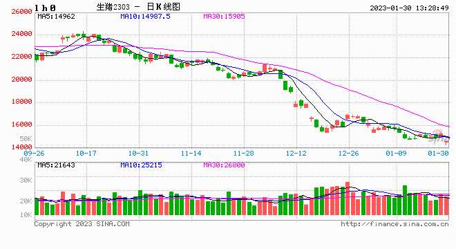 摘要: 投資咨詢業(yè)務(wù)資格:證監(jiān)許可【2011】1292號(hào)朱迪(投資咨詢資格編號(hào):Z0015979)2023年1月30日星期一行情導(dǎo)讀:今日生豬開(kāi)盤(pán)大幅下挫,03合約圍繞14500附近震蕩,
