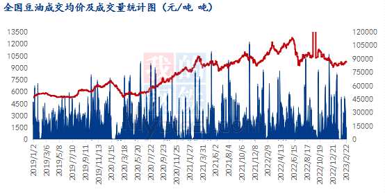 歷經(jīng)三年疫情的洗禮,經(jīng)濟發(fā)展逐步減緩,至疫情政策優(yōu)化后,2023年1月,下游成交總量約為44.87萬噸,較年前12月62.62萬噸,雖減少17.75萬噸,減幅為28.35%,但畢竟面臨春節(jié)大家剛陽康之后,需要時間修正,油廠整體開機率不高。而同比去年同期48.94萬噸減少約為4.07萬噸,減幅為8.32%,因去年2月春節(jié),正常工作日相較去年減少7-8天的時間,也可說總體恢復與去年同期水平相差不多。因此進入往年的淡季,面臨2-3月因缺豆以及豆粕脹庫及季節(jié)性檢修等計劃,油廠總體開機不高,現(xiàn)貨方面供應相對偏緊。