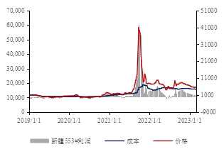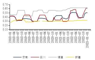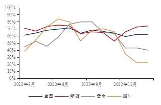 在上文中,全國(guó)三大產(chǎn)區(qū)利潤(rùn)均有縮窄的情況,四川成本倒掛情況較為嚴(yán)重,云南成本接近價(jià)格,利潤(rùn)幾近于0,新疆則利潤(rùn)情況較為可觀。從2022年11月進(jìn)入枯水期后,利潤(rùn)逐漸縮窄,對(duì)西南產(chǎn)區(qū)存在供應(yīng)擠出的效應(yīng),四川開(kāi)工率從22年11月的65.9%下降至22%,云南開(kāi)工率從63%跌至39%,新疆開(kāi)工率從52.7%升至74%,全國(guó)開(kāi)工率則從64%小幅下降至63%。