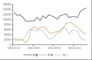●供應(yīng)總體寬松。當(dāng)前南北成本差異大,開(kāi)工情況分化,云南成本與價(jià)格基本持平,四川成本較高,部分企業(yè)倒掛虧本,西南開(kāi)工情況下降較多;新疆生產(chǎn)成本較低,開(kāi)工情況較好,基本覆蓋西南缺口,總體供給穩(wěn)定。因西南整體產(chǎn)能占比較小,疊加新疆產(chǎn)量增加較多,西南挺價(jià)力度稍弱。