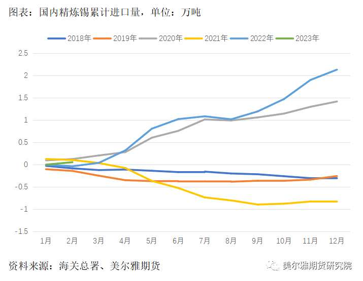 進(jìn)出口方面,根據(jù)海關(guān)數(shù)據(jù),國(guó)內(nèi)1-2月精煉錫分別凈進(jìn)口0和0.05萬(wàn)噸。2022年11月中旬后精煉錫進(jìn)口窗口關(guān)閉,根據(jù)wind測(cè)算,目前(3月30日)精煉錫的進(jìn)口盈利為-10965.32元/噸,進(jìn)口窗口仍為關(guān)閉狀態(tài),預(yù)計(jì)隨著2022年11月之前的進(jìn)口訂單到貨完畢,國(guó)內(nèi)將難有凈進(jìn)口補(bǔ)充,減輕國(guó)內(nèi)累庫(kù)壓力。