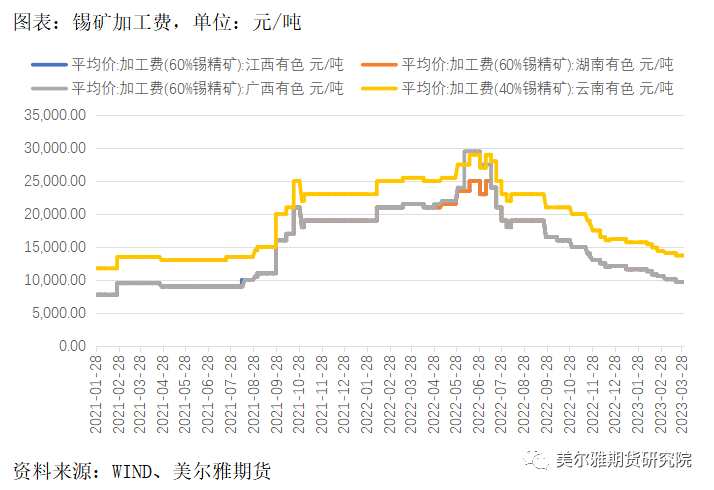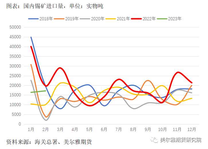 截止3月30日,云南40%錫精礦加工費(fèi)報(bào)13700元/噸,環(huán)比再下滑400元/噸,延續(xù)下滑趨勢(shì),是礦端寬松程度邊際走緊的信號(hào)。從錫礦進(jìn)口量來(lái)看,2023年1-2月國(guó)內(nèi)共進(jìn)口33573實(shí)物噸,同比下滑43.78%,環(huán)比亦走弱。錫價(jià)從2021-2022年初的高點(diǎn)大幅下滑后,礦山利潤(rùn)相應(yīng)大幅減少,錫價(jià)甚至一度逼近高成本礦山成本線,加之前期緬甸的錫礦庫(kù)存在錫價(jià)高點(diǎn)后被消耗,預(yù)計(jì)今年剩余時(shí)間的錫礦進(jìn)口量將回落至常態(tài),這是錫價(jià)在下游需求持續(xù)冷淡時(shí)仍能被托底的主要原因。