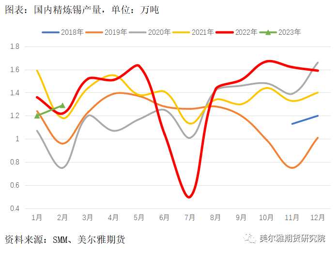 加工費(fèi)持續(xù)下調(diào),煉廠利潤(rùn)被壓縮,但尚未突破煉廠成本線,冶煉產(chǎn)出總體較為平穩(wěn)。國(guó)內(nèi)1-2月共計(jì)產(chǎn)出精煉錫2.49萬(wàn)噸,同比累計(jì)減少3.49%。結(jié)合礦端的充裕程度和加工費(fèi)來(lái)看,2023年精煉錫產(chǎn)量應(yīng)該很難達(dá)到2022年同期的水平,初步預(yù)計(jì)與2021年相當(dāng)或略低。在需求端下滑的情況下,供給端的收縮可減輕精煉錫的過(guò)剩量,托底錫價(jià)。