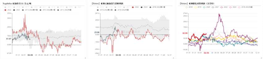 本周亞洲石腦油裂解走強(qiáng),石腦油蒸汽裂解利潤(rùn)從虧損恢復(fù)至正利潤(rùn),重整經(jīng)濟(jì)性持續(xù)季節(jié)性偏高,處于往年同期偏高水平。