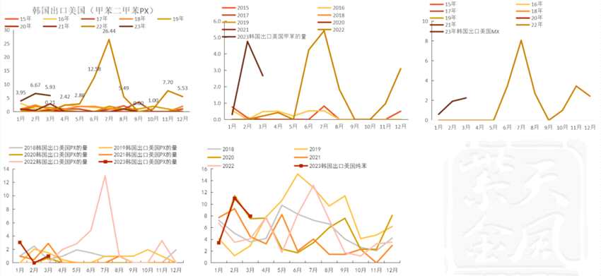 22年四季度起韓國(guó)芳烴出口美國(guó)量增加,今年2-3月份出口量不少(當(dāng)時(shí)套利窗口打開(kāi),可能有提前備貨行為)。