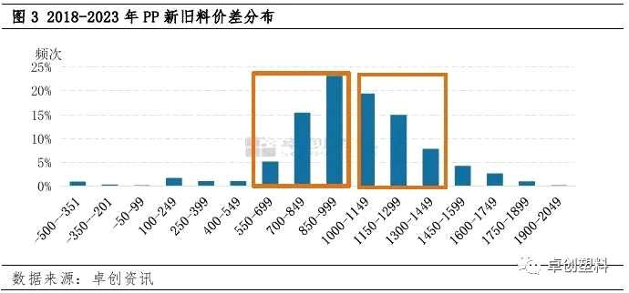 近六年P(guān)P新舊料相關(guān)系數(shù)0.84,關(guān)聯(lián)度較高。長期以來PP新舊料合理價差在1000-1500元/噸,但從圖3可以看出,近六年價差整體偏窄。其中價差在1000元/噸以上占比僅50.57%,將近一半占比低于合理水平。從近六年價差分布特點(diǎn)來看,價差集中在700-1299元/噸,占比高達(dá)72.95%,但只有34.39%在1000元/噸以上(處于合理價差水平),并且處于合理價差的偏低水平(1000-1300元/噸)。另外,價差在700-1000元/噸占比高達(dá)38.56%。近六年P(guān)P新舊料價差整體偏窄,2023年多數(shù)交易日處于合理水平之下,而在今年五月份新料報盤持續(xù)下行,新舊料價差不斷探底,對再生PP的壓力不言而喻。