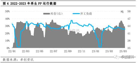 長期以來再生PP與新料PP有較強(qiáng)的聯(lián)動性,通常價格趨勢呈現(xiàn)趨同性。在五一假期后,新料市場持續(xù)在下行通道,再生PP作為替代品其低價優(yōu)勢逐步減弱,出貨阻力不斷加大。在弱需求與高庫存壓力下,繼續(xù)降負(fù)荷運(yùn)行。