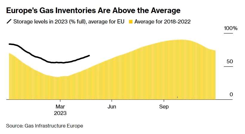 此外,歐洲正進(jìn)入今年最熱的幾個(gè)月,庫(kù)存量約為66%,遠(yuǎn)高于歷史平均水平,這表明歐洲可能已經(jīng)翻過(guò)了能源危機(jī)最嚴(yán)重時(shí)期的一頁(yè)。遠(yuǎn)高于正常水平的庫(kù)存和充足的液化天然氣供應(yīng)很大程度上消除了下一個(gè)冬天面臨的任何能源風(fēng)險(xiǎn)。