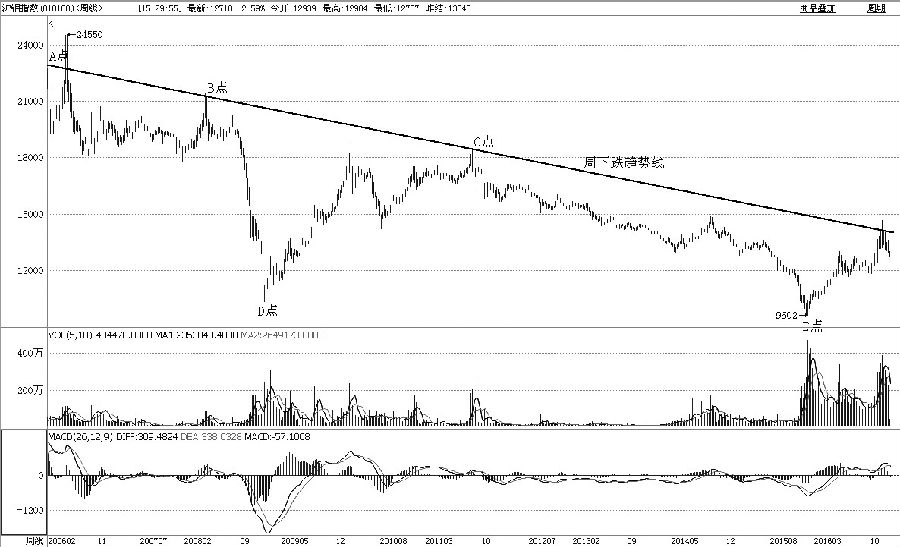 摘要: 滬鋁目標位可看至12000元/噸自2006年4月開始,滬鋁指數(shù)進入三浪三級別的大空頭趨勢。其中,A點至D點是主跌第1大浪,C點至E點是主跌第3大浪,并且形成了由A點、B點和C點所構(gòu)成的周線級下跌趨勢線