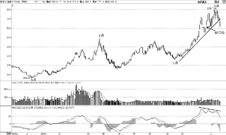 鐵礦石指數(shù)自年初以來的上漲過程整體可以分為三個階段:A點至B點為上升第1浪;B點至C點是a—b—c調(diào)整階段;C點至D點為上升第3浪,走勢比較強勁,是主升浪的概率較大。不過,從11月15日以來的日K線形態(tài)上看,鐵礦石盡管強勢,但明顯出現(xiàn)振蕩幅度加大多頭減弱的跡象,MACD指標出現(xiàn)頂部背離。上周五鐵礦石收中陰,險守第3浪多頭趨勢線,但昨日巨陰下破,宣告進入主跌階段。目標位上,預(yù)計11月23日留下的跳高缺口是首要位置,價格在550元/噸。 (中信期貨 顧敏忠)