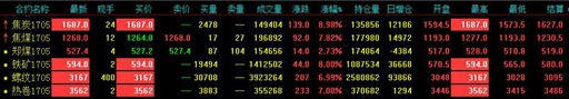 摘要: 昨日一開(kāi)盤(pán),黑色系便維持高位運(yùn)行,隨后震蕩走高,尾盤(pán)更是集體漲停。連續(xù)兩日的拉漲使黑色系再現(xiàn)“王者”風(fēng)范。截至收盤(pán),鐵礦石期貨上漲8%,焦炭、焦煤期貨分別上漲8.98%和7.82%,螺紋鋼、熱卷也不甘