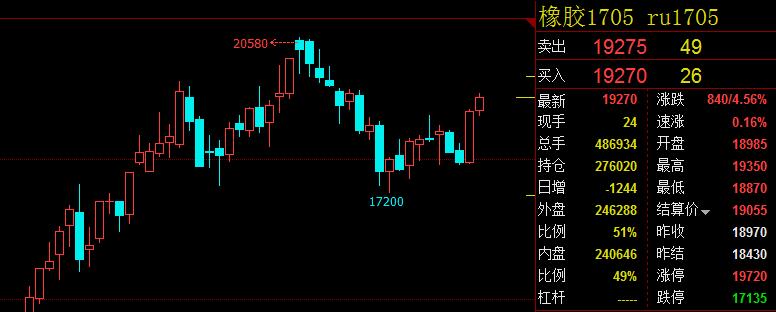 摘要: 今日(1月10日)大宗商品再度掀起漲停潮,橡膠也不甘落后,繼昨日拉起6.24%的一根大陽線后,今日以4.56%的漲幅領漲能化板塊。截止收盤,橡膠1705合約報19270元/噸,成交48萬余手,持倉27
