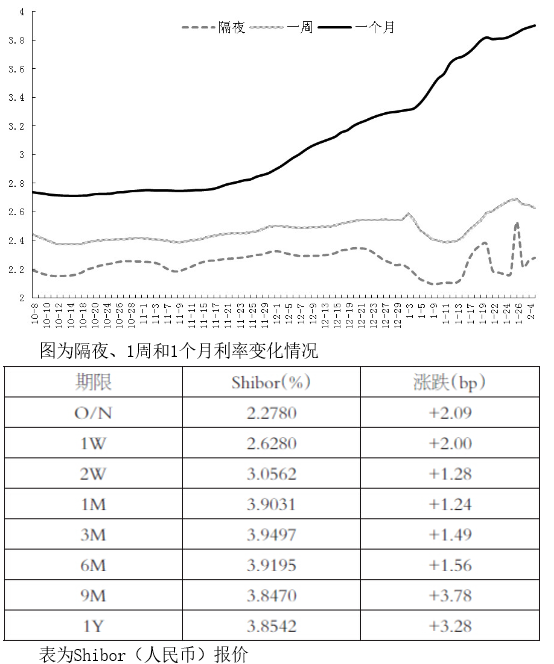 2月6日,Shibor市場(chǎng)全部上漲,中長(zhǎng)期利率繼續(xù)走高。春節(jié)過后,短期利率沖高回落,但中長(zhǎng)期利率未停上行腳步,一個(gè)月利率繼續(xù)創(chuàng)新高,彰顯中期資金供求趨緊。代表性利率的7天Shibor上漲2.00個(gè)基點(diǎn)至2.628%。美元指數(shù)繼續(xù)振蕩筑底,人民幣匯率在6.85附近企穩(wěn),但遠(yuǎn)期繼續(xù)貶值的預(yù)期不變。隔夜利率微漲2.09個(gè)基點(diǎn)至2.278%,環(huán)比小幅上漲。14天利率上行1.28個(gè)基點(diǎn)至3.0562%。一個(gè)月利率上行1.24個(gè)基點(diǎn)至3.9031%,繼續(xù)創(chuàng)新高。春節(jié)過后,資金需求開始回歸正常,但大量企業(yè)面臨開工,甚至補(bǔ)充原材料或其他項(xiàng)目采購,短期內(nèi)對(duì)資金的需求有增無減。由于中國經(jīng)濟(jì)的企穩(wěn)好轉(zhuǎn),市場(chǎng)認(rèn)為未來資金需求增加,中長(zhǎng)期利率繼續(xù)上行,3個(gè)月、6個(gè)月、9個(gè)月和1年期利率分別報(bào)3.9497%、3.9195%、3.8470%、3.8542%。