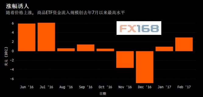 據(jù)彭博行業(yè)研究匯總的數(shù)據(jù),截至上周五(2月13日)為止,2017年2月已有近30億美元資金涌入與大宗商品掛鉤的多頭策略ETF之中,有望創(chuàng)下去年7月以來的最大單月流入規(guī)模。盡管這其中有26億美元資金流入了貴金屬ETF,但能源、農(nóng)業(yè)和工業(yè)金屬ETF也有資金流入。