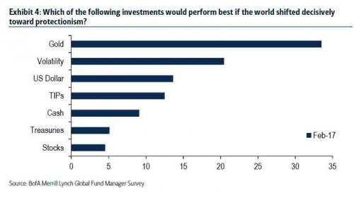 在這樣的背景下,另外還有一個有趣的問題和答案——當美國銀行在調(diào)查過程中提出“如果全球市場轉(zhuǎn)向貿(mào)易保護主義道路,那么未來以下投資類型中哪一種類型將會表現(xiàn)最好?”這樣一個問題時,調(diào)查對象的答案也是非常清晰的。