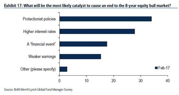 在美國銀行發(fā)起調(diào)查之前,有一個讓人非常感興趣的問題一直都未曾被外界注意到,這個問題就是:“對于持續(xù)8年的股票市場牛市來說,最有可能導致其終結(jié)的催化劑是什么?”