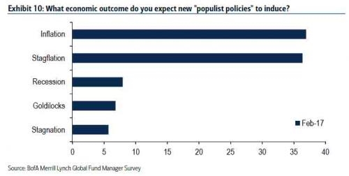 緊隨其后的一個問題是:“你期待新的‘民粹主義政策’帶來什么樣的經(jīng)濟后果?” 調(diào)查結(jié)果暗示了一個奇怪的分裂:一方面,來自華爾街的基金經(jīng)理們普遍認為,特朗普的政策會對股票市場有利——最明顯的跡象就是人們看到標普指數(shù)一直在高位運行;另一方面,超過一半以上的調(diào)查對象表示,特朗普必定會推行自己的“親民政策”,其對經(jīng)濟造成的后果可能有以下幾種:滯漲、衰退或停滯不前。