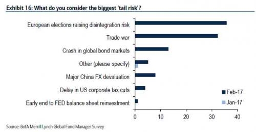 下面的圖表顯示,當被問及本月最大的“尾部風險”是什么時,36%的調(diào)查對象認為——歐洲地區(qū)部分國家的選舉會讓歐盟解體是最大的風險;而有32%的調(diào)查對象表示:是特朗普執(zhí)政后全球潛在存在的貿(mào)易戰(zhàn)風險;另外13%的調(diào)查對象則認為——最大的風險是“全球債券市場的崩潰”。
