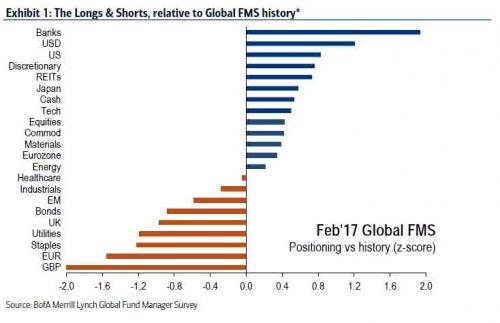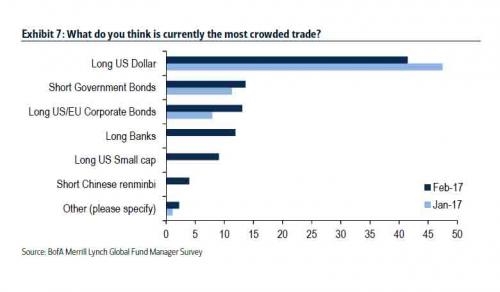 此外,需要大家引起注意的另外一個問題是:“你認為最擁擠不堪的交易是什么?”關(guān)于這一問題的調(diào)查結(jié)果與上個月的結(jié)論類似:41%的調(diào)查對象,同樣也是占絕大多數(shù)的基金經(jīng)理認為,是長期做多美元;而有14%的調(diào)查受訪對象表示,是短期做空國債債券(從上月開始已經(jīng)出現(xiàn)中等幅度的增加);只有13%的調(diào)查對象認為是長期做多美國/歐洲公司債券。