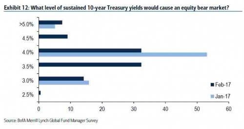 最后,在目前這個利率不斷上升的時代,一個看似不相干卻又非常重要的問題是:“對于10年期國債收益率來說,持續(xù)什么樣的水平將會導致股市出現(xiàn)熊市?”調(diào)查對象們的回答是——至少就目前來看——國債收益率偏低所以不會傷及股市。其中64%的調(diào)查對象認為,要想讓股市出現(xiàn)熊市,10年期國債的收益率必須要保持在3.5-4%之間。