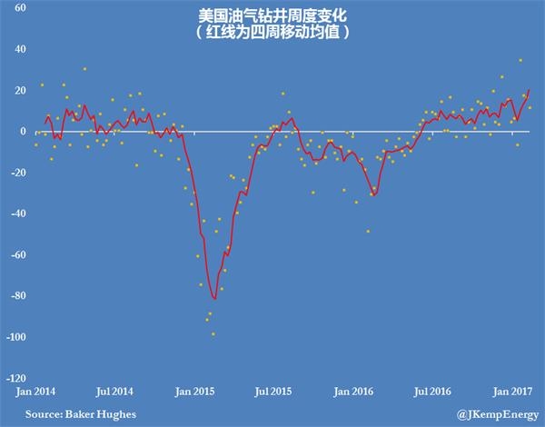 油氣鉆井活躍度自2016年年中的不斷提高也會在2017年對柴油需求成為利多。由于絕大多數(shù)鉆井的泵系統(tǒng)都是柴電發(fā)動機的,其他的輔助電力也需要柴油發(fā)電機。而設備和工料的運輸,包括壓裂砂和壓裂液等對貨運需求非常大。自2016年5月以來,全美油氣鉆井數(shù)已經(jīng)提高了330口或80%,且活躍鉆井數(shù)正在按周均20口的速度提高,目前預計這一增長還能持續(xù)下去。