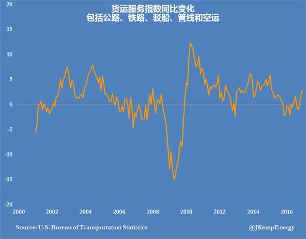 由于從燃煤發(fā)電向天然氣發(fā)電的轉變、油氣鉆探滑坡和零售業(yè)廣泛積壓庫存,2015-2016年美國貨運量因此飽受打擊。根據(jù)美國運輸統(tǒng)計局(U.S. Bureau of Transportation Statistics)的數(shù)據(jù),2014年12月至2016年3月間按照季節(jié)調(diào)整的公路、鐵路、管線、駁船和空運合并運輸量在下跌了3.4%。