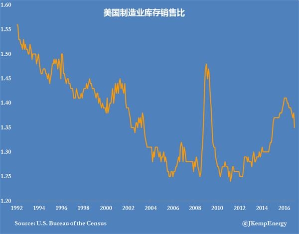 最后,美國制造業(yè)、分銷商和零售商在2014-2016年原材料和制成品方面的庫存積壓的情況已經(jīng)緩解了。根據(jù)美國人口調(diào)查局(U.S. Census Bureau)的數(shù)據(jù),此前美國整體庫存銷售比從2014年7月的1.30:1快速提高到了2016年1月、3月的1.41:1的峰值。但是2016年4月以來庫存銷售比持續(xù)下降,2016年年底前已經(jīng)回到了1.35:1.